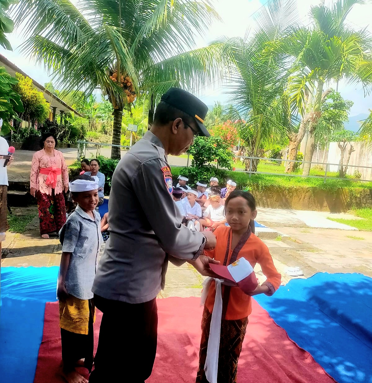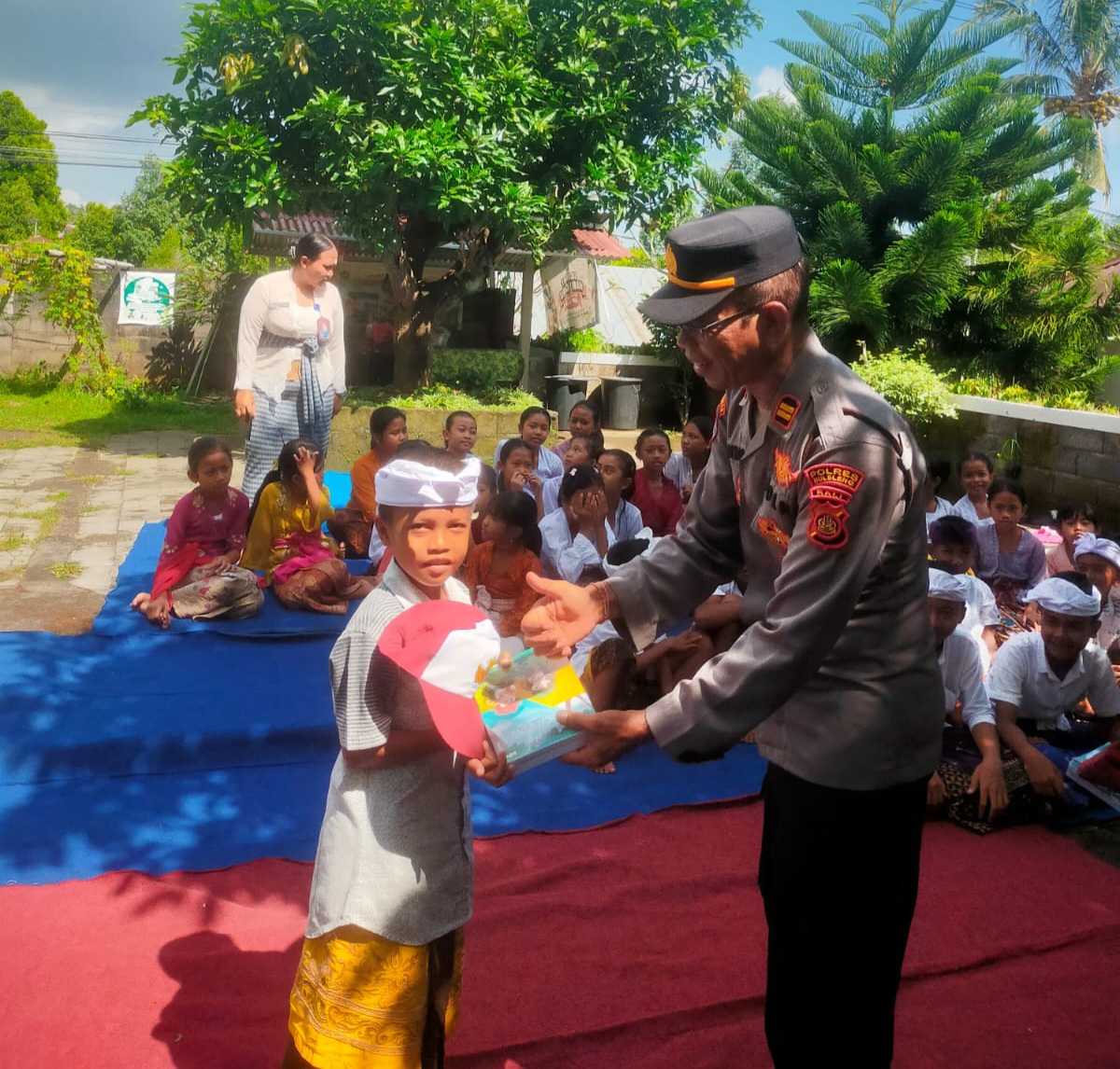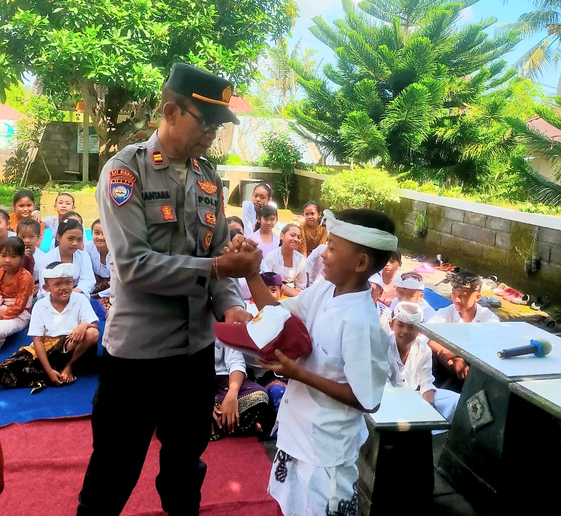 Sebagai bentuk kepedulian, Panit I Binmas Polsek Sukasada juga menyerahkan bantuan berupa sarana kontak kepada tiga siswa yang kurang mampu, berupa alat tulis dan topi sekolah, guna mendukung semangat belajar mereka.