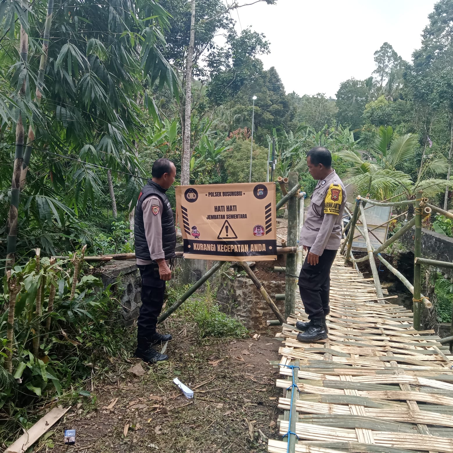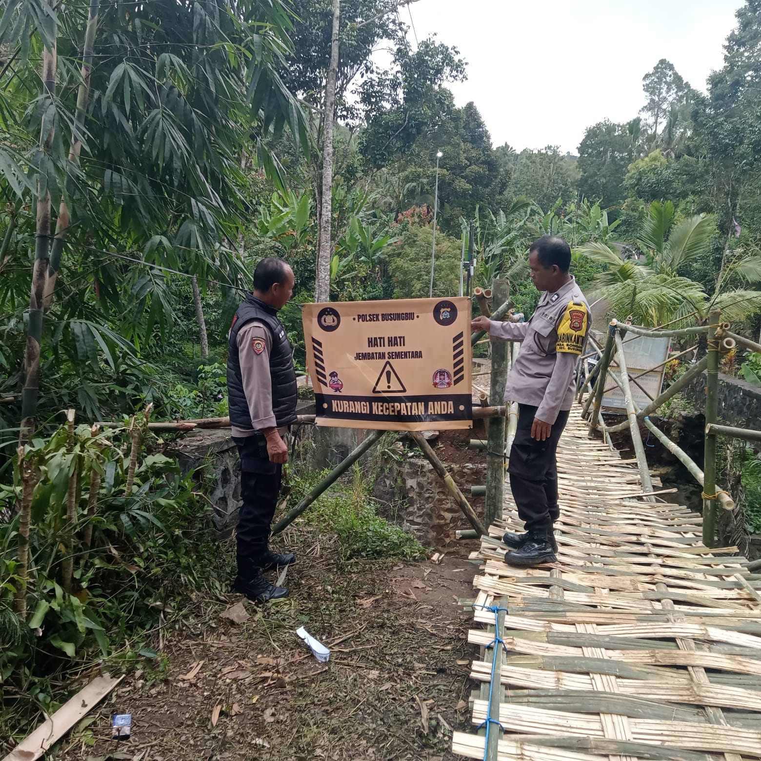 Kasubsektor Tegalasih Aiptu Kadek Asoi, S.H. bersama Bhabinkamtibmas Desa Dapdap Putih dan Desa Bongancina turun langsung memasang spanduk imbauan keselamatan di jembatan darurat yang menjadi penghubung vital antar kedua desa.